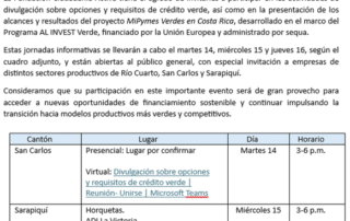 Estimadas empresarias y estimados empresarios: La Fundación Ciudadanía Activa tiene el agrado de invitarles a participar en las actividades de divulgación sobre opciones y requisitos de crédito verde, así como en la presentación de los alcances y resultados del proyecto MiPymes Verdes en Costa Rica, desarrollado en el marco del Programa AL INVEST Verde, financiado por la Unión Europea y administrado por sequa. Estas jornadas informativas se llevarán a cabo [...]